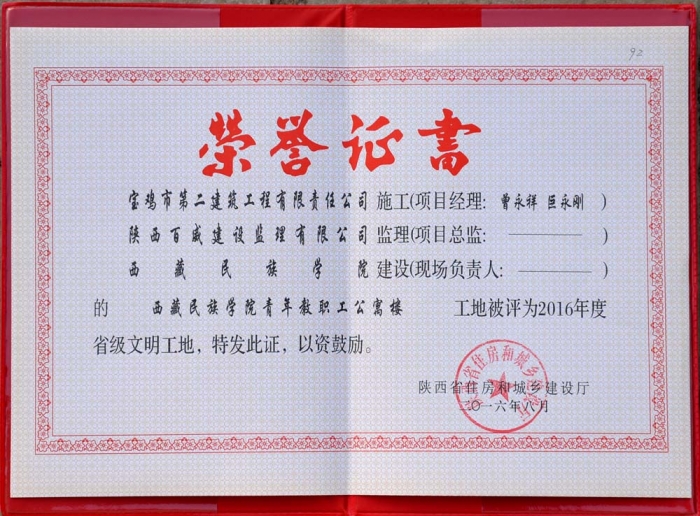 2016年省級(jí)文明工地(西藏民族學(xué)院證書)