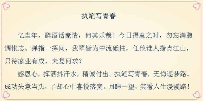 “現(xiàn)在,青春是用來奮斗的;將來,青春是用來回憶的?!碑?dāng)所有的經(jīng)歷化作記憶,那些年少時為理想揮灑的汗水,為成功付出的艱辛,終將成為彌足珍貴的人生財富。